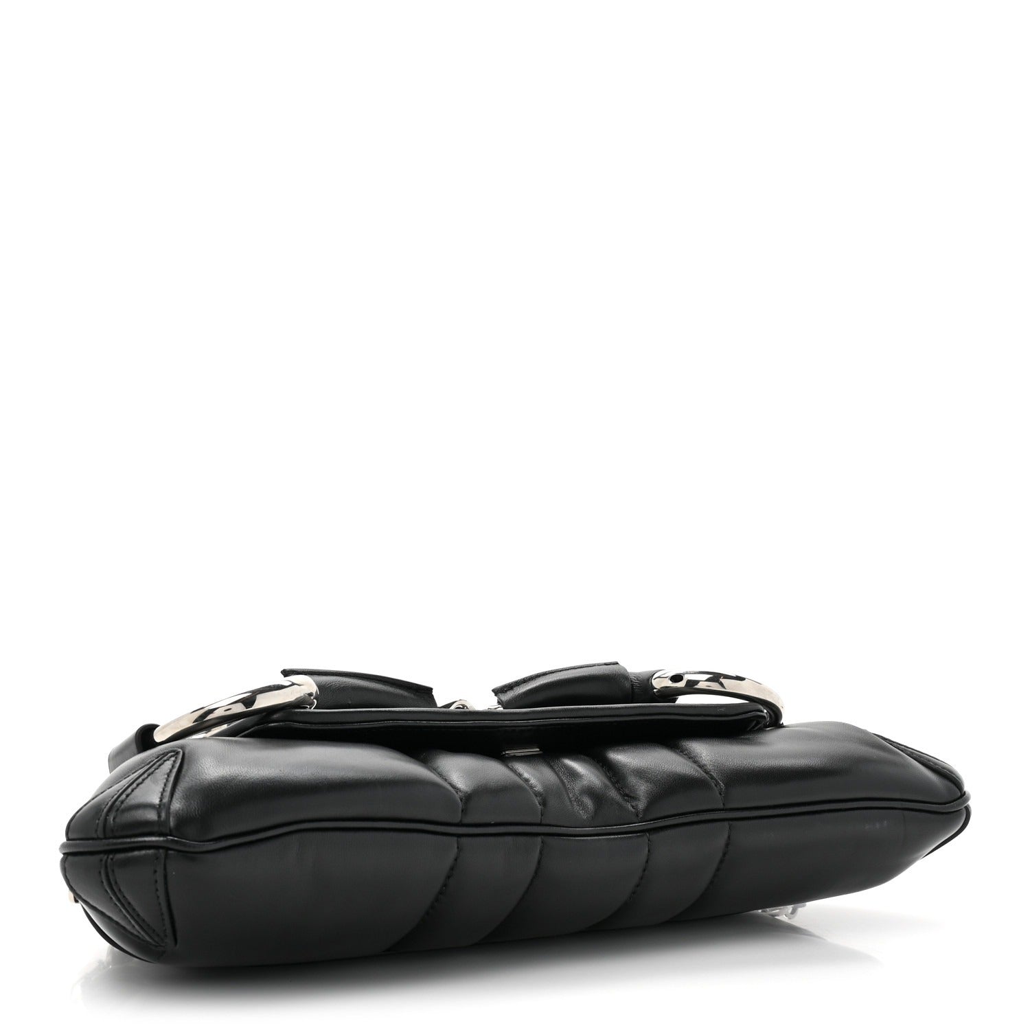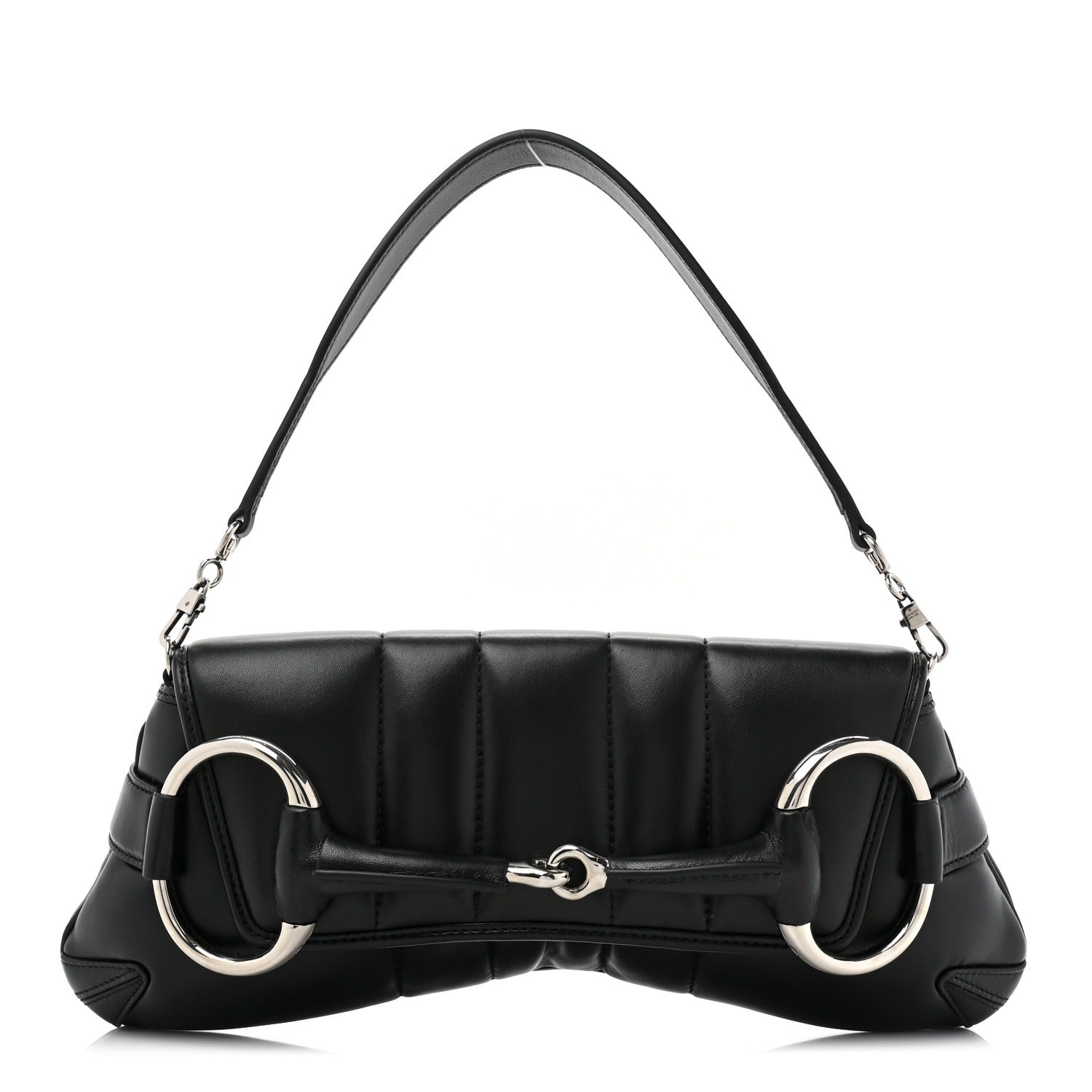This is an authentic  Horsebit Chain Shoulder Bag in Black. This stylish shoulder bag is crafted of beautiful nappa leather featuring a looping leather shoulder strap, an optional shoulder strap, and silver horsebit detail. The top flap opens to a black satin interior.