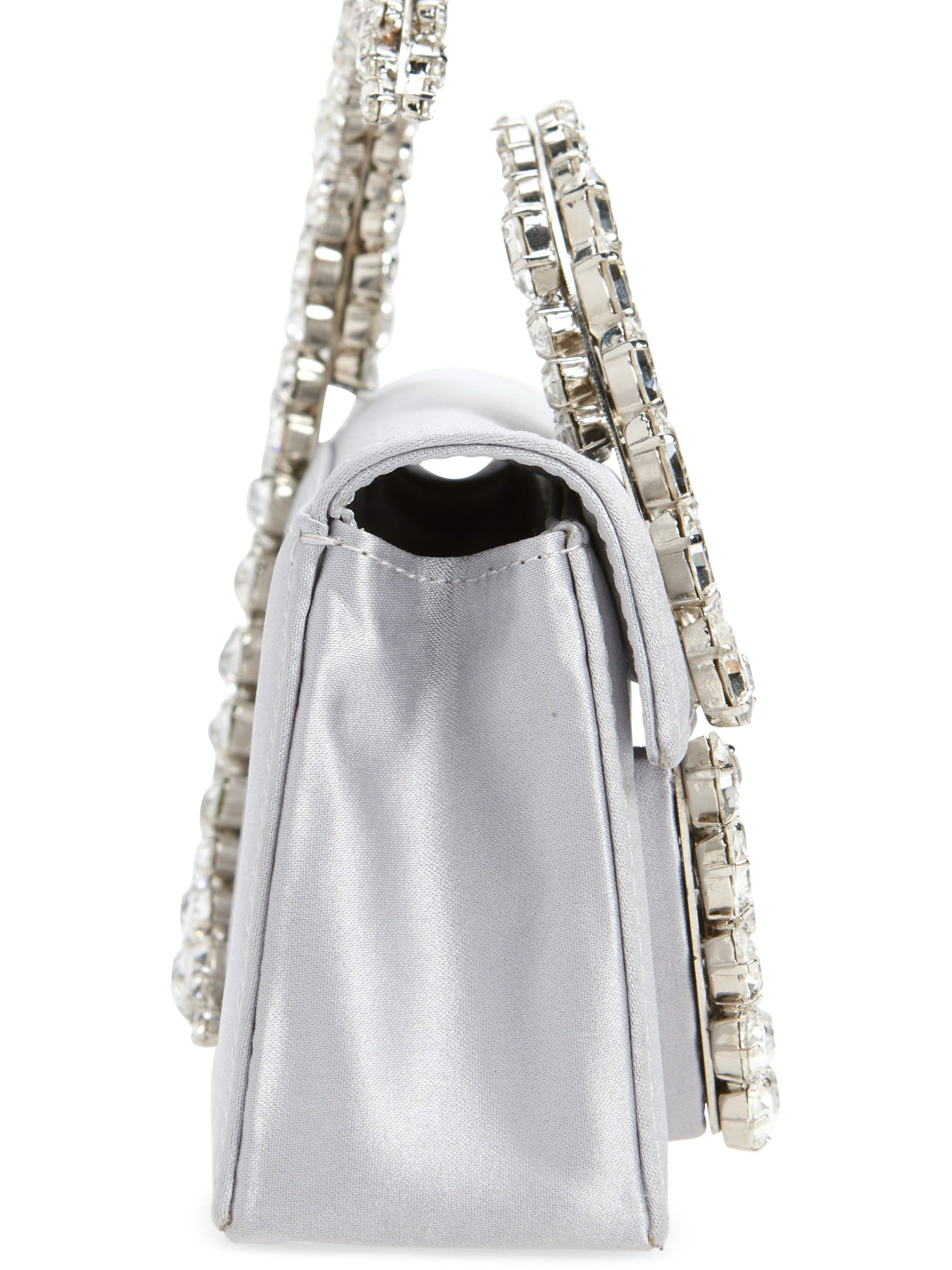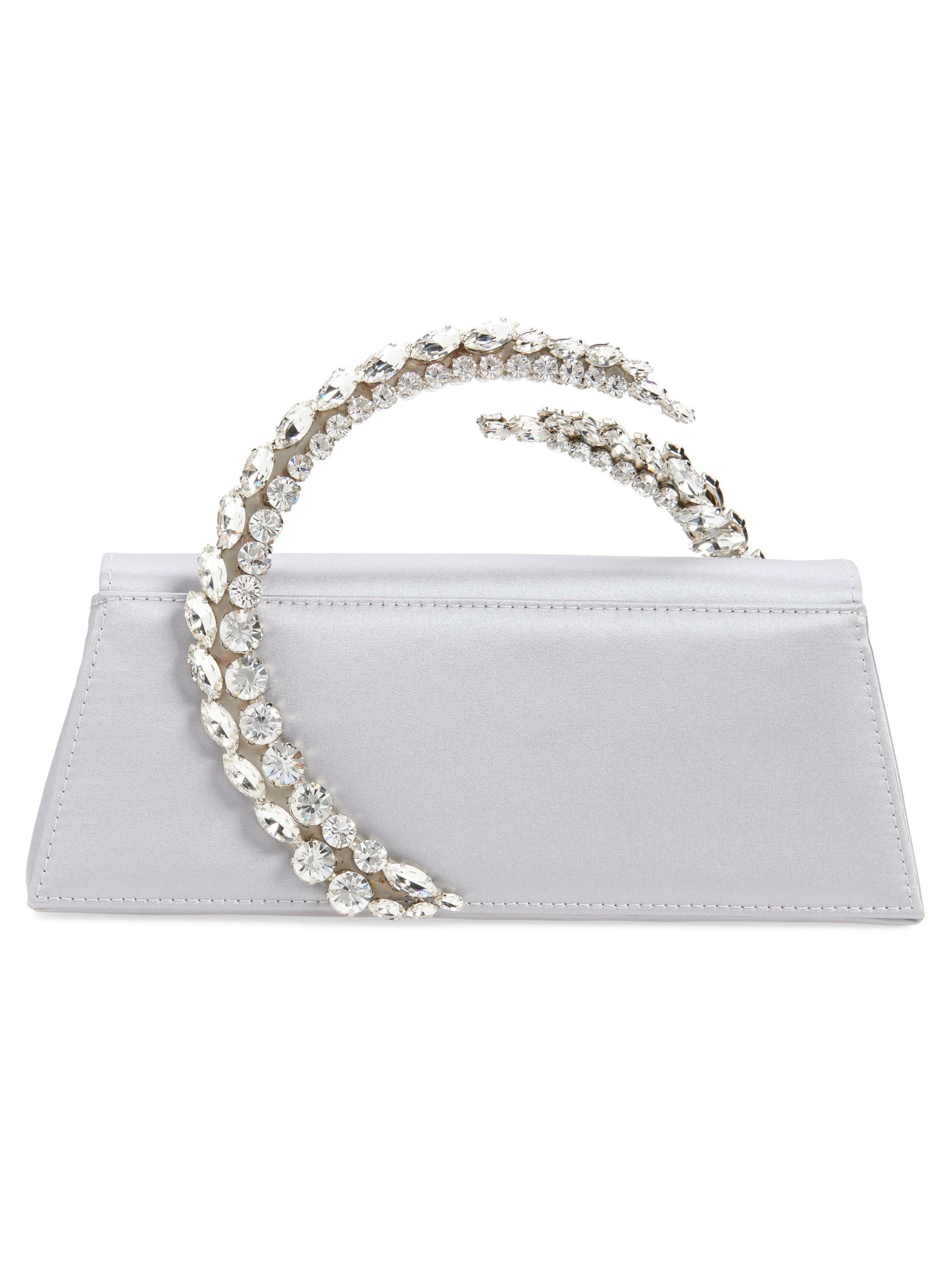 This boxy satin clutch is ready for your next night out with a spiral handle sparkling with crystal embellishments.
