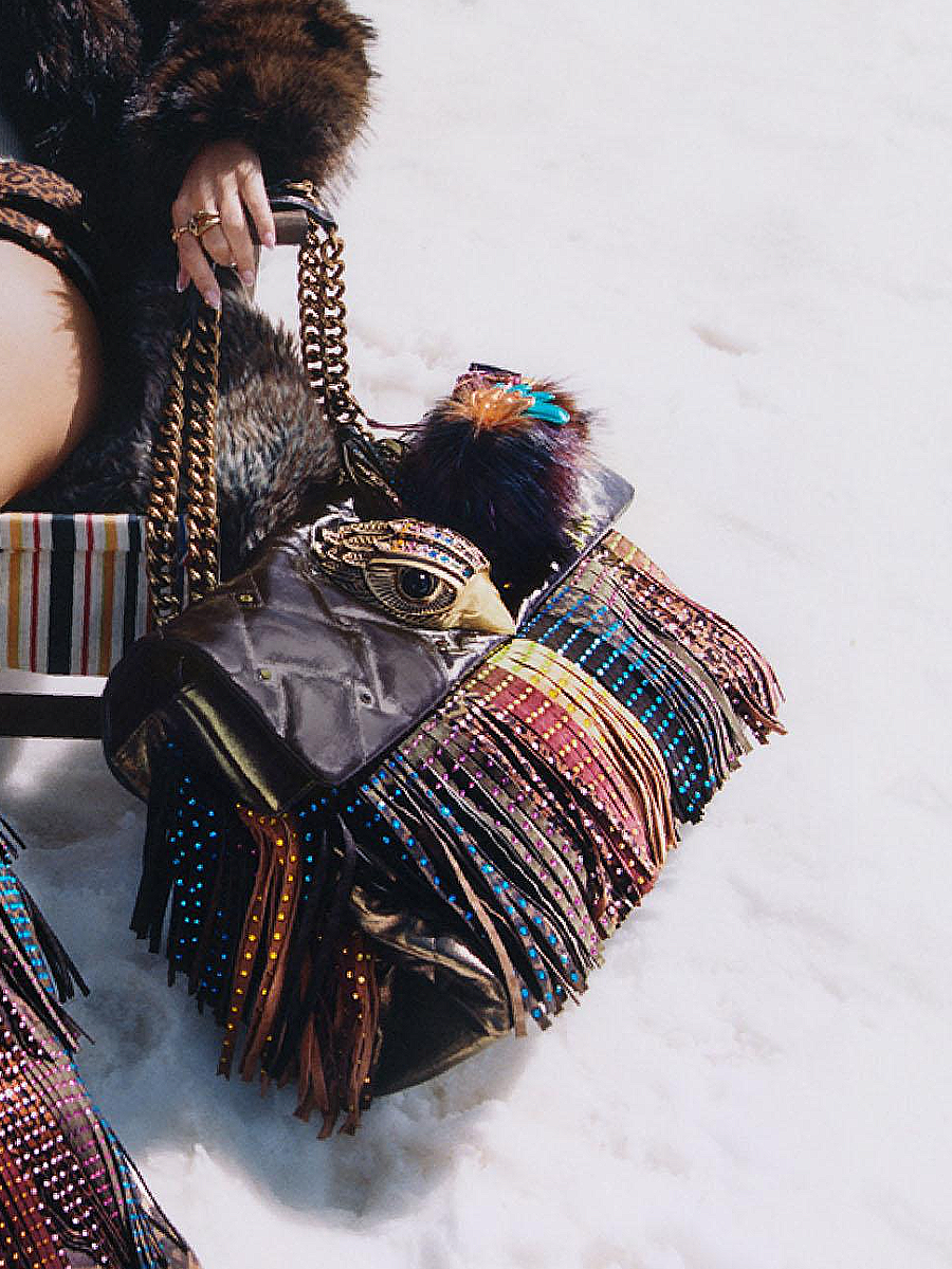 The Fringed Retro Shoulder Bag is crafted from a deep brown leather on the flat and a metal bronze leather on the base. There is a suede tassel fringe detail surrounding the base which is embellished with crystals. The XL antiqued brass eagle head features crystals sitting on the front flap.