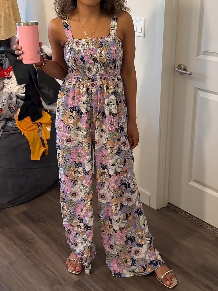 - Stunning jumpsuit with eye-catching floral print, perfect for spring events and garden parties.