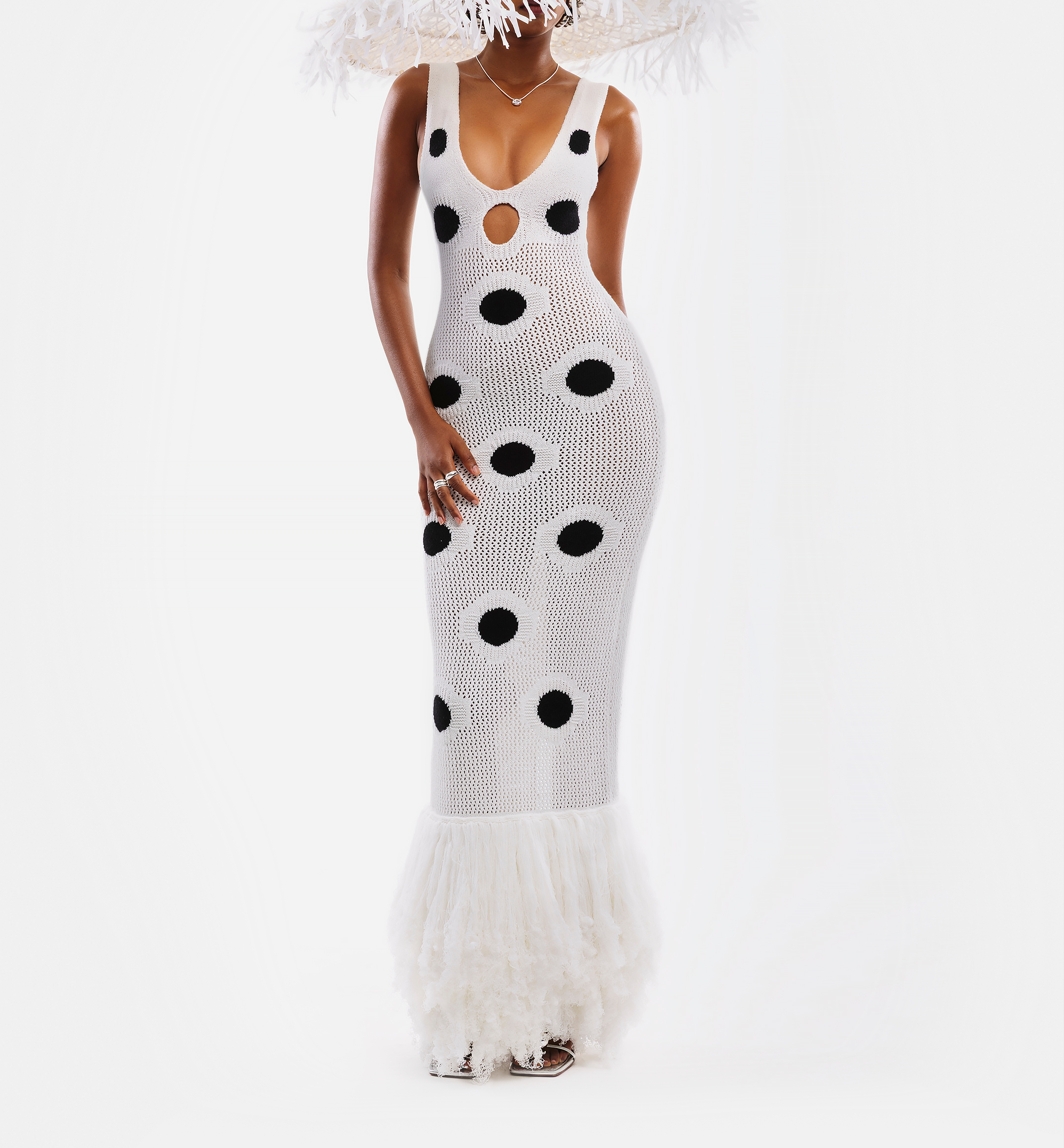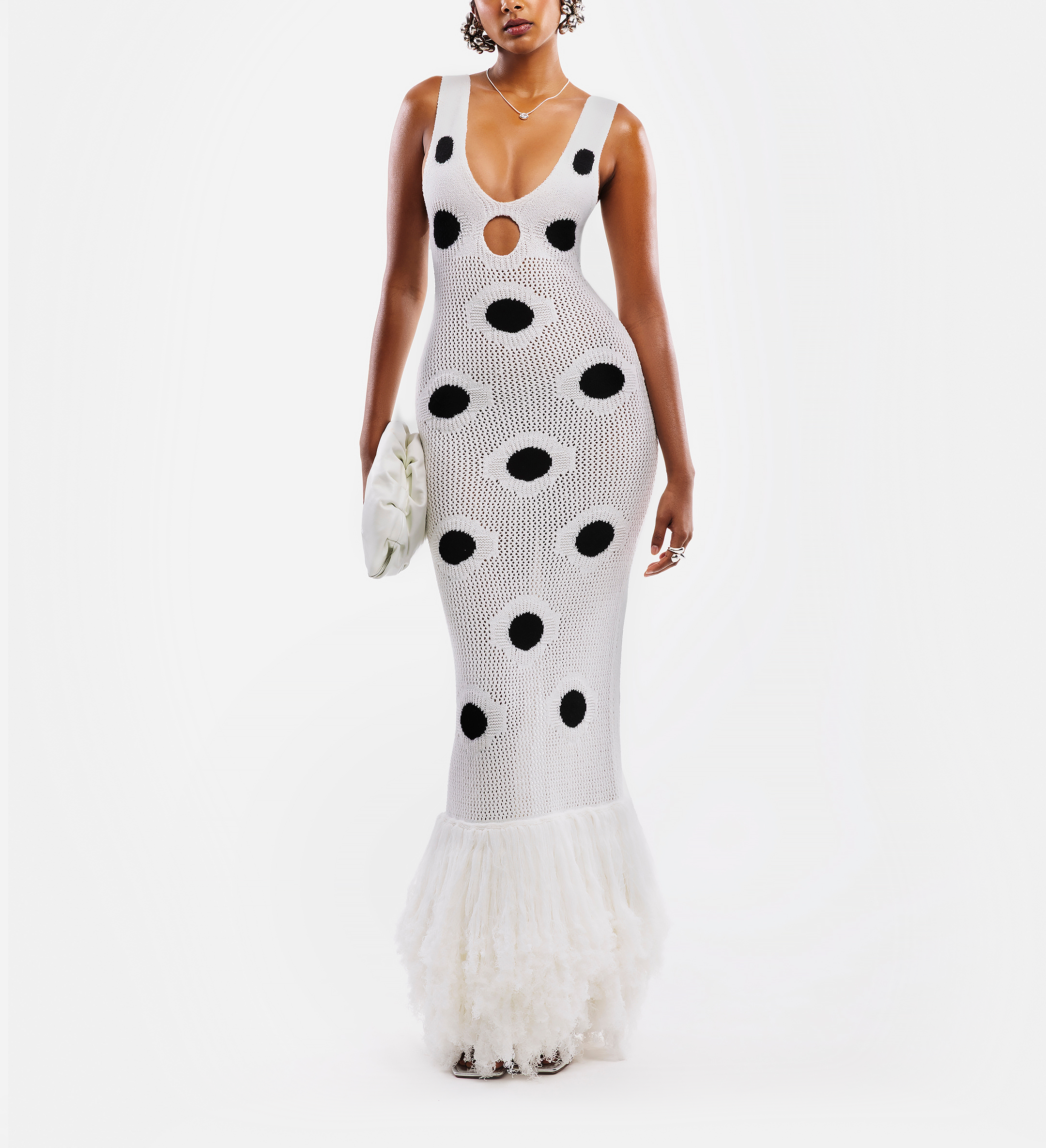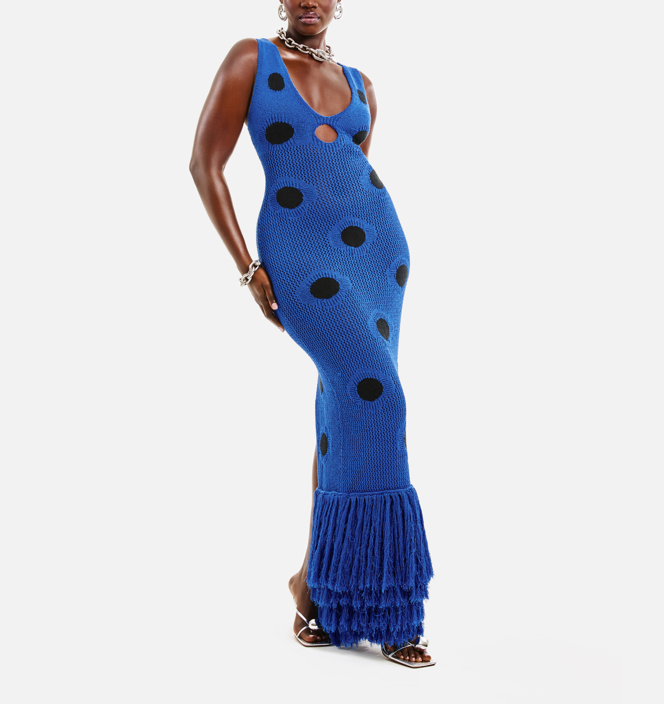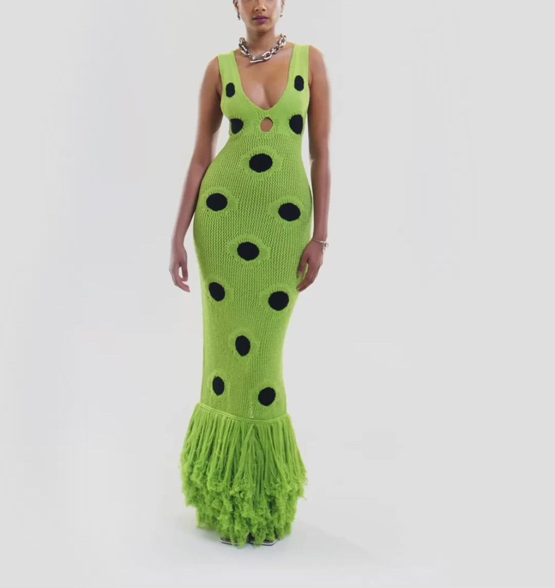 This is a fitted knit dress that features a deep v-neckline and a small cutout detail underneath. She is finished with a tassel hemline, and polka dot detailing.��