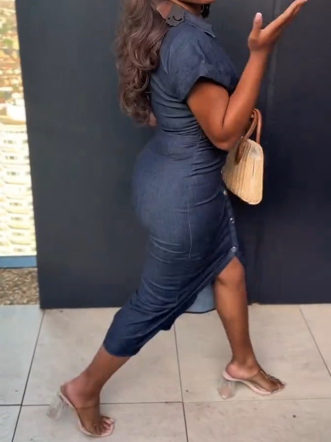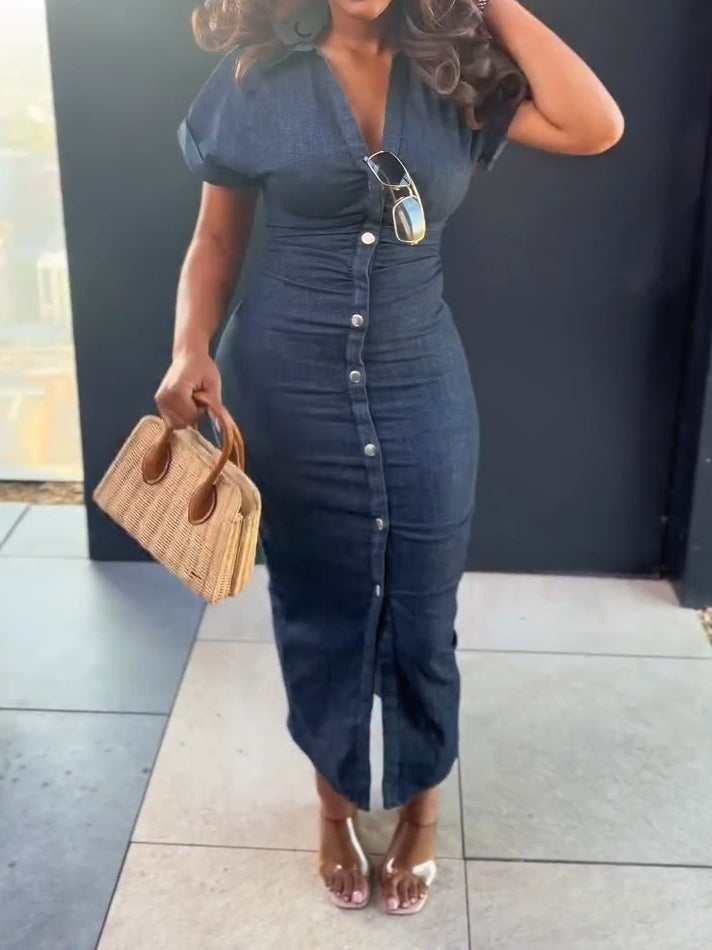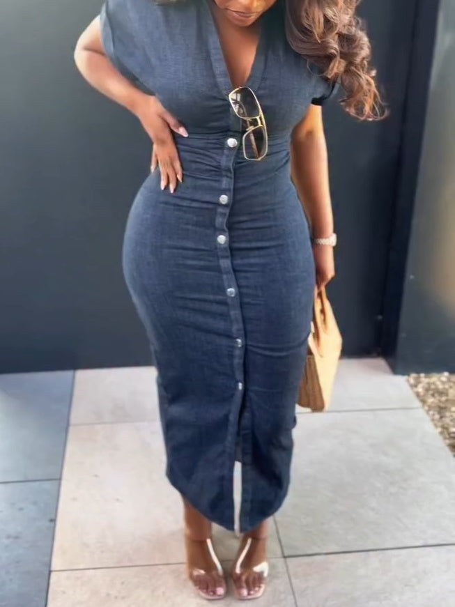 Crafted from premium denim, this dress boasts a sleek, single-breasted design that flatters your figure. Its soft, textured fabric feels luxurious against your skin, making it ideal for both casual outings and more formal events.