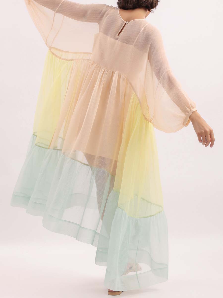 Panelled, free-size, Kota Doriya Dress with round neckline and back button fastening.