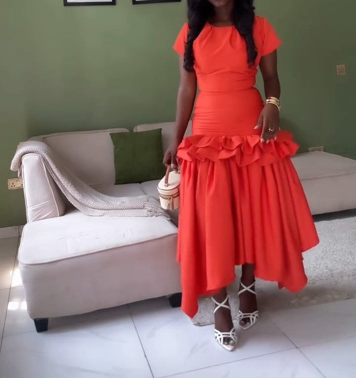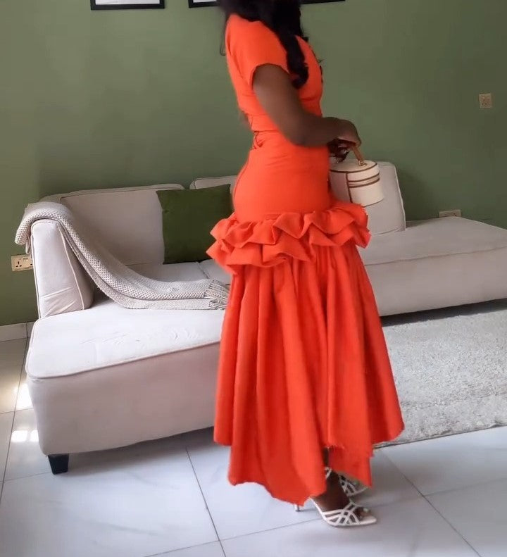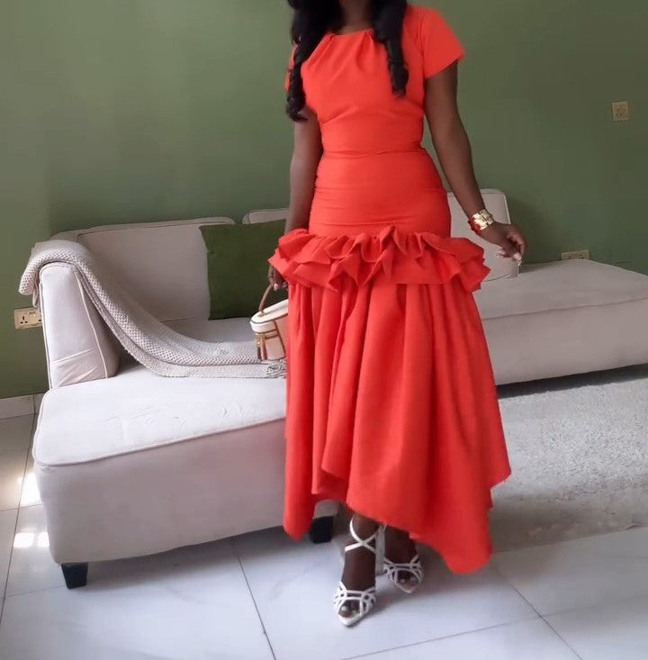 Orange Round Neck Short Sleeve Ruffle Hem Dress