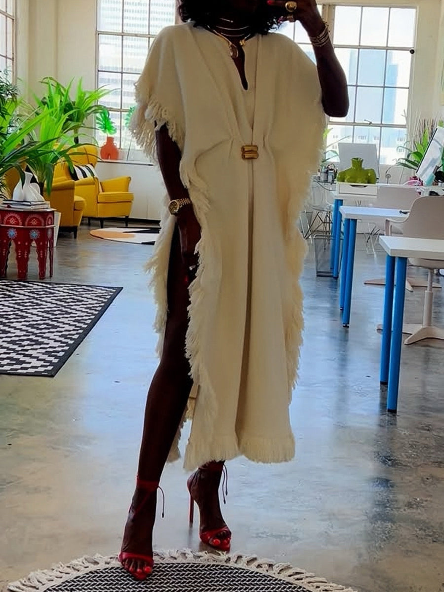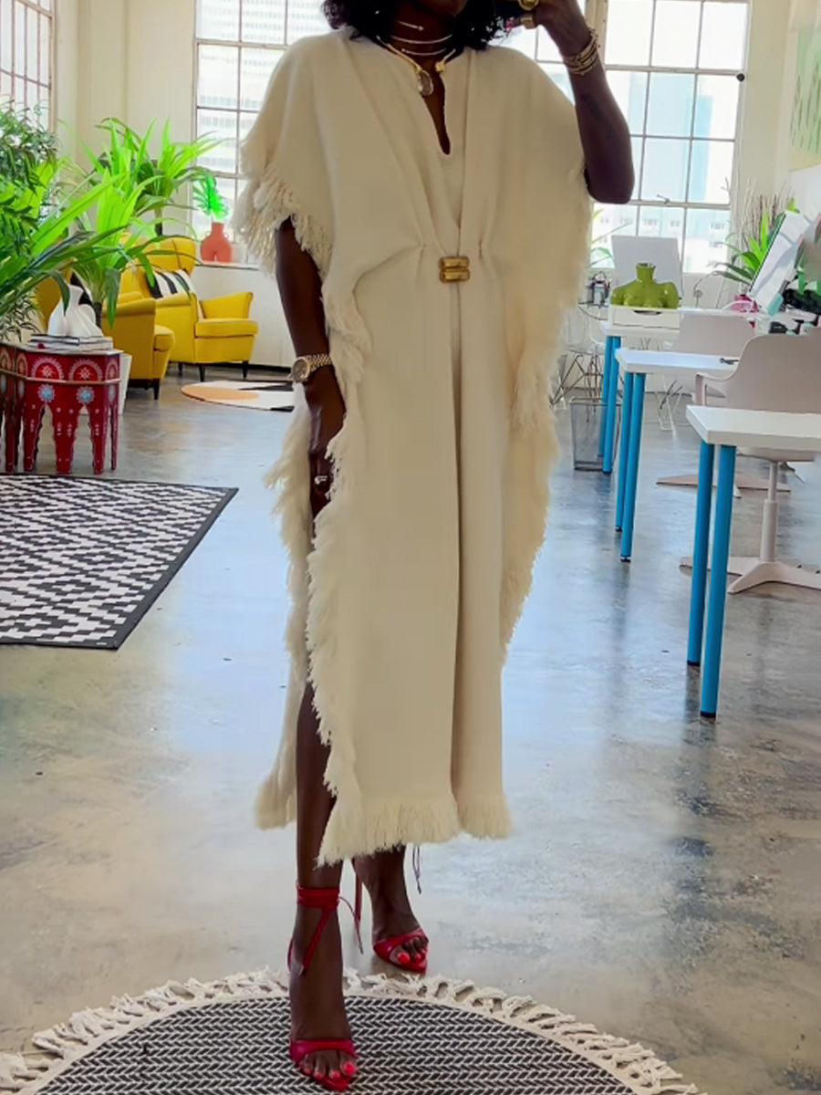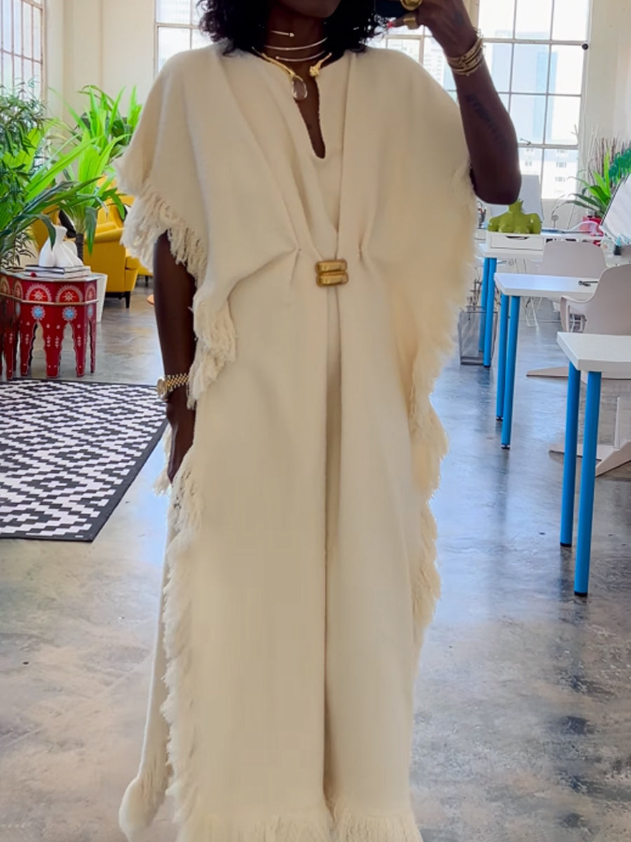 A highlight from the Spring/Fall 2025 collection, this artful dress is crafted from an organic cotton blend with a V-neck and cap sleeves, draping to a long train. Trimmed with tonal fringe, it's the ultimate modern take on bohemian chic.