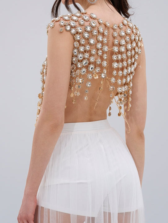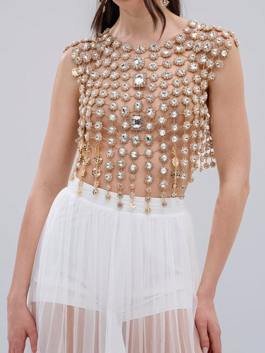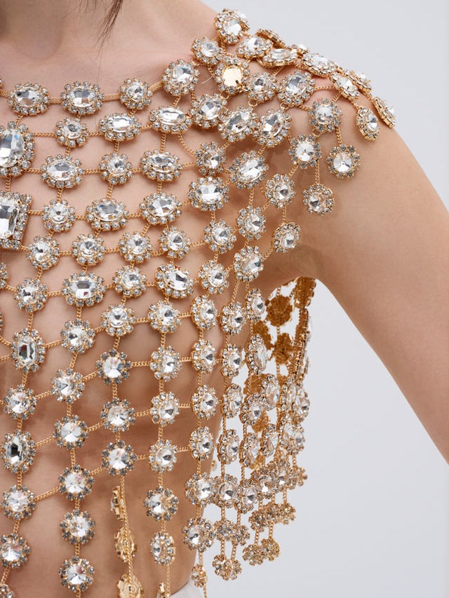 This unlined sparkling piece is crafted from a gold metallic chain link base and features a cage-like construction with glittering flower-inspired gemstone embellishments throughout, coordinating cascading gemstone detailing that creates an asymmetrical hemline, short sleeves, a rounded neckline, and an exposed back with three adjustable chain link accents with lobster clasps.
