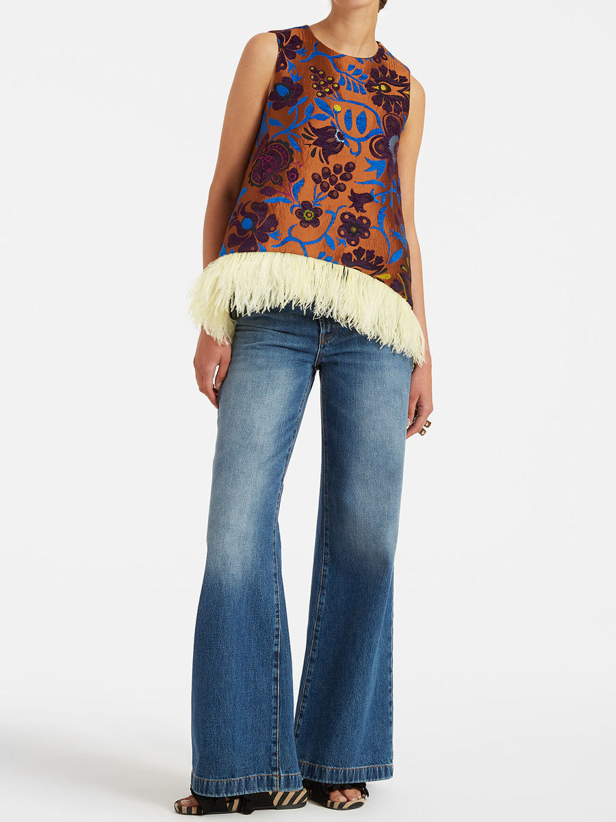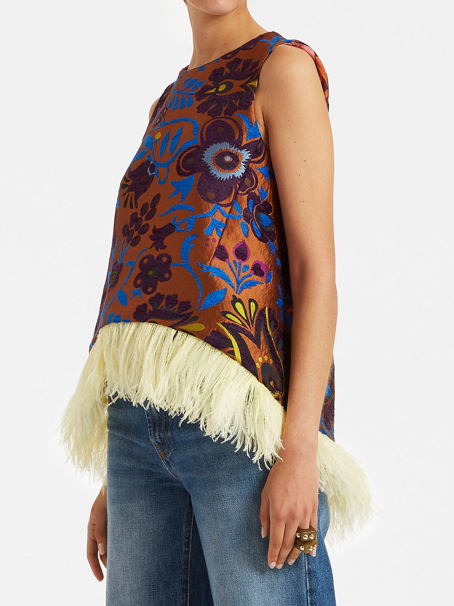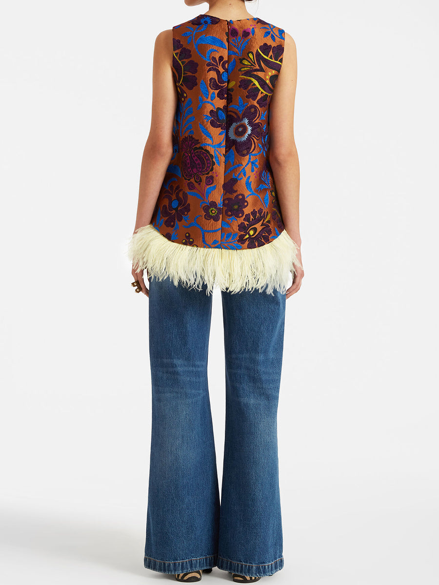 As far as interesting silhouettes go, the Printed Sleeveless Feather Trim Top top may win the gold star. Prime for summer weddings, black tie beach parties and beyond, the alluring trapeze silhouette is crafted in our shimmering new Gyn jacquard and hemmed with a fabulous feather trim. Undoubtedly dazzling styled with the stunning Pencil Skirt to match, we also love it with denim cut-offs for a maximalist gelato run moment.