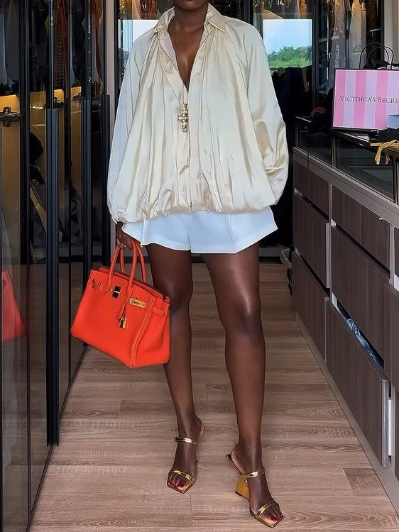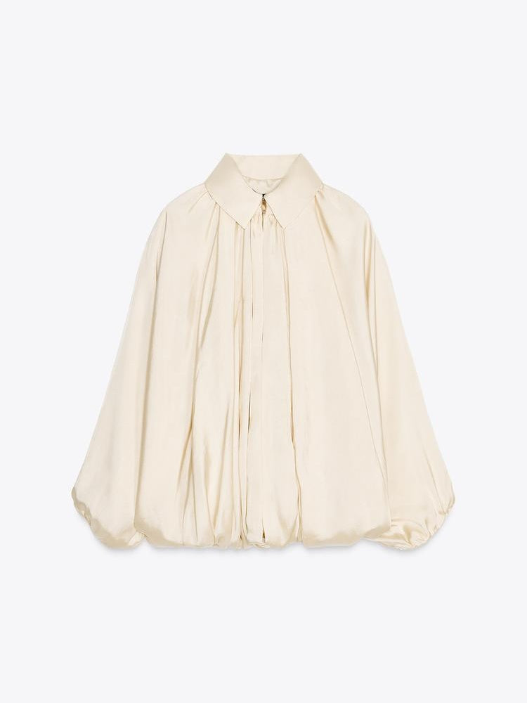 Bomber jacket made of lyocell yarn. Lapel collar and long puffed sleeves. Puffed hem with pleats. Front zip closure.