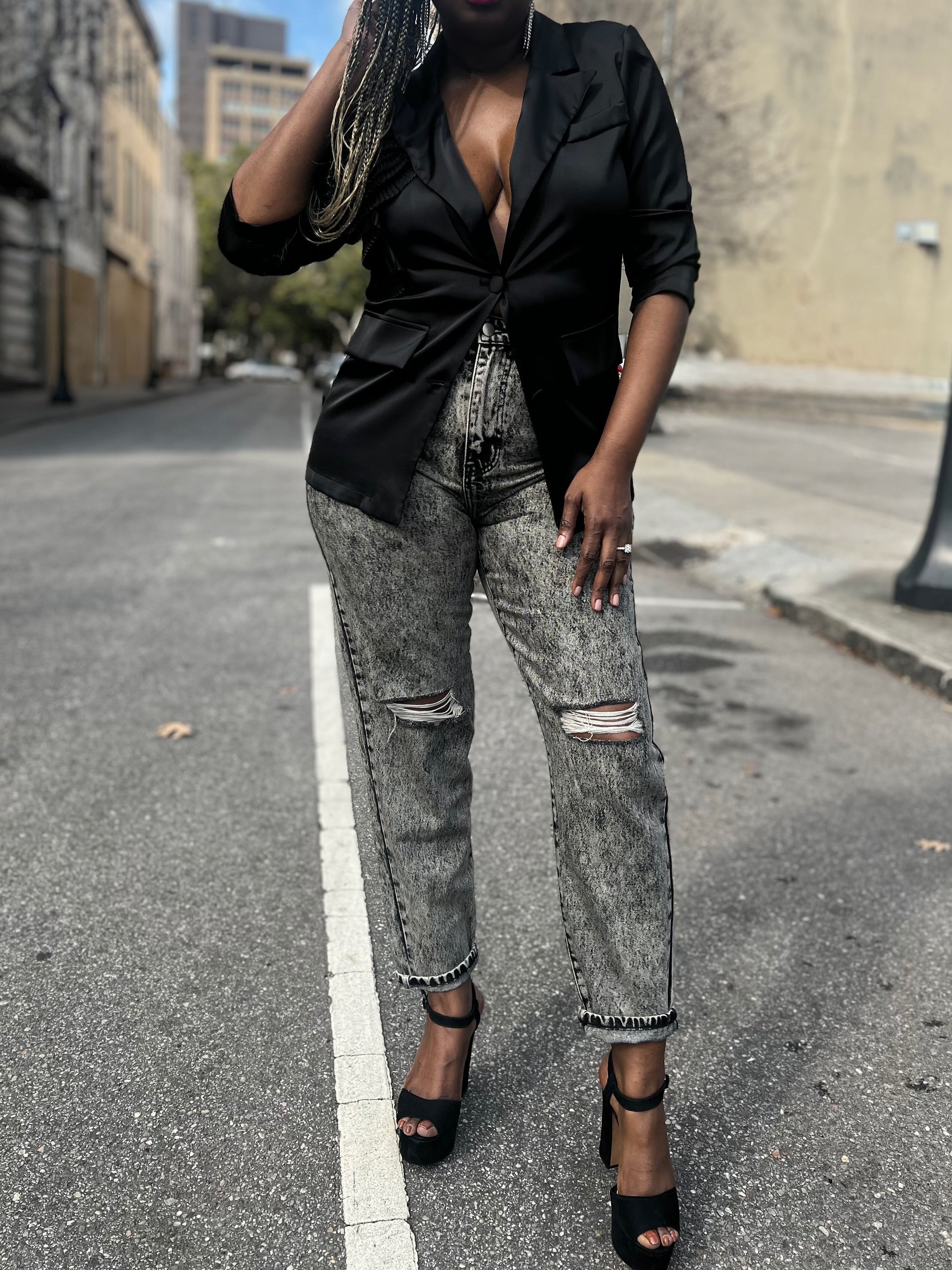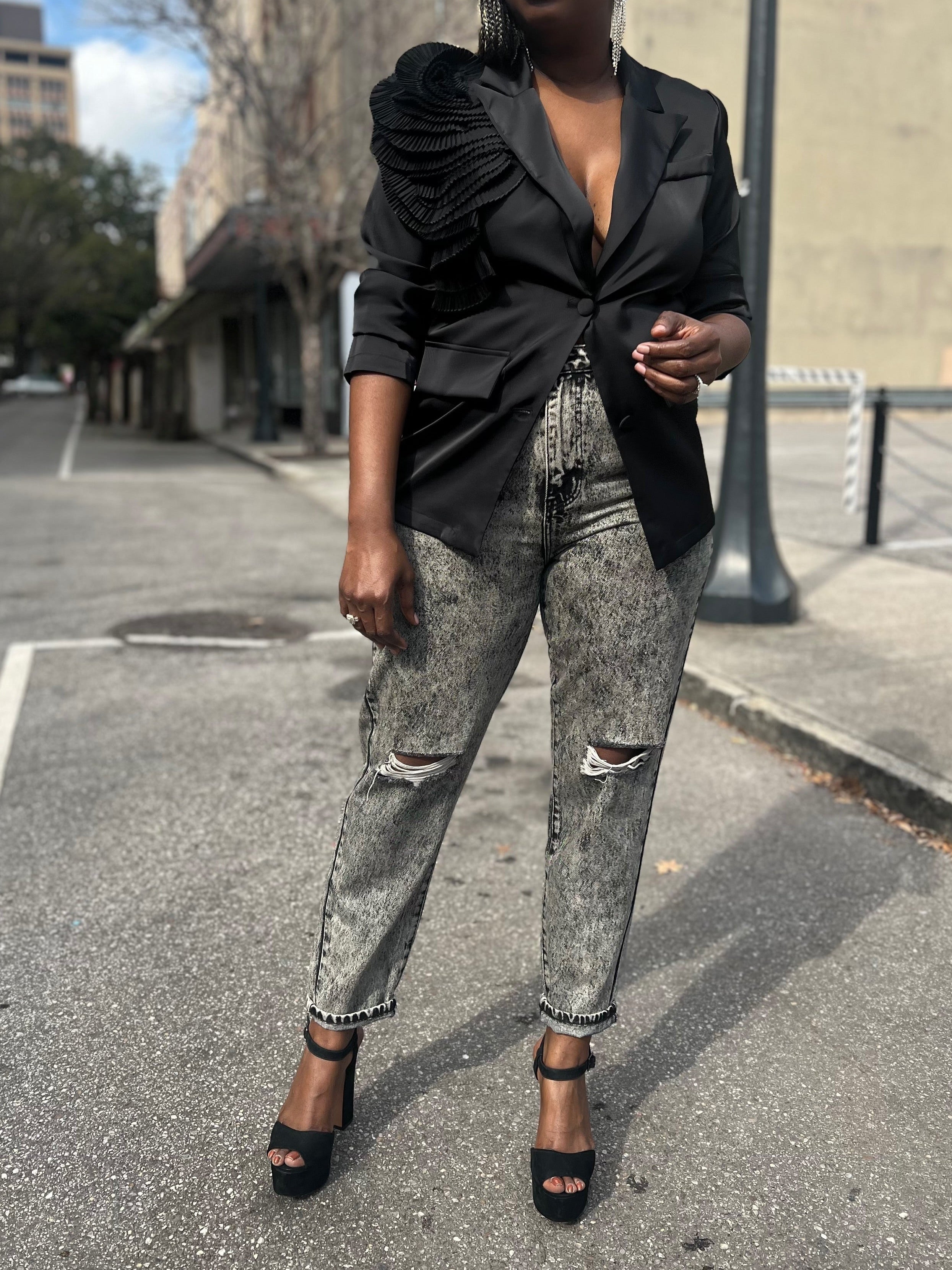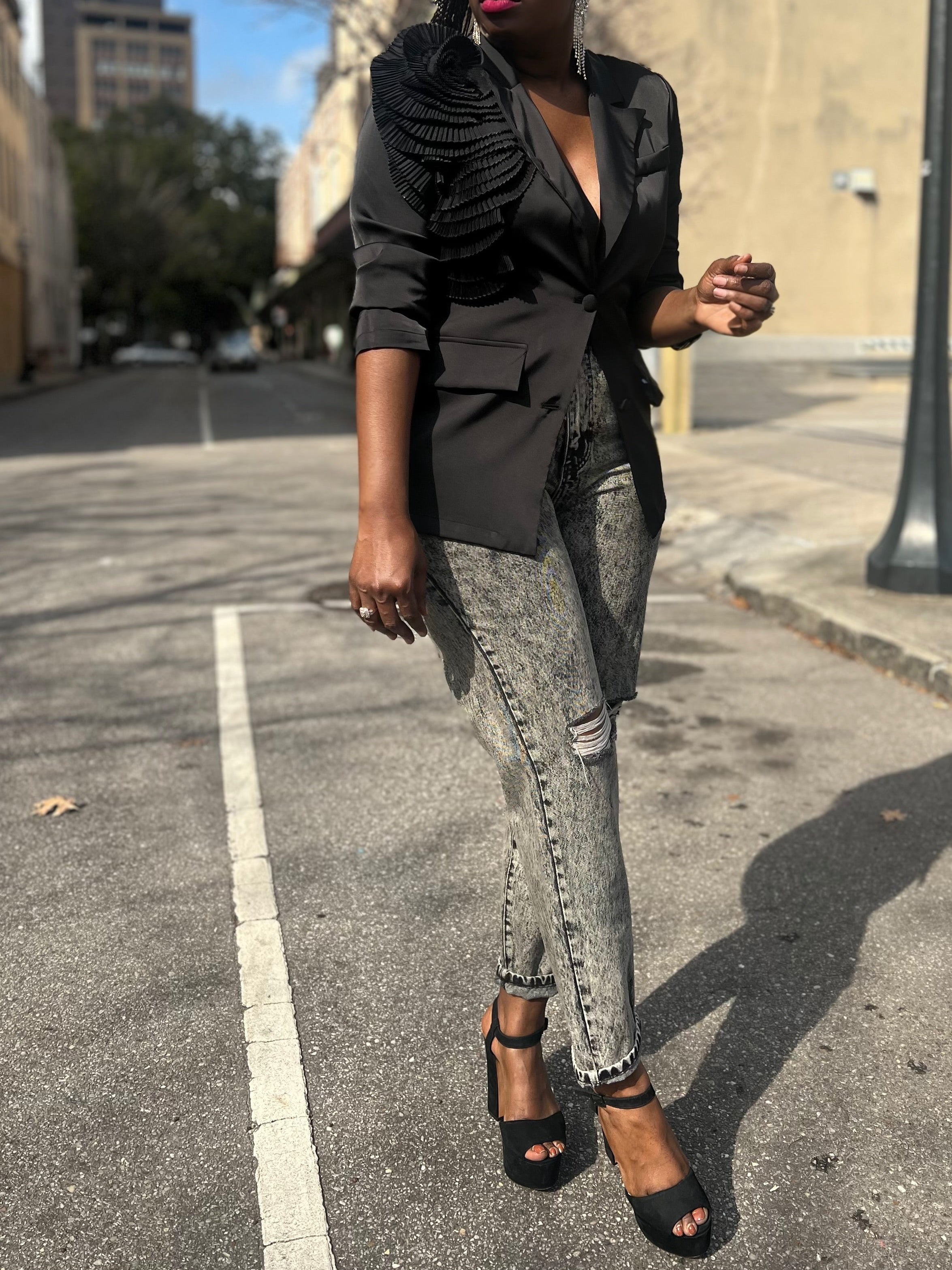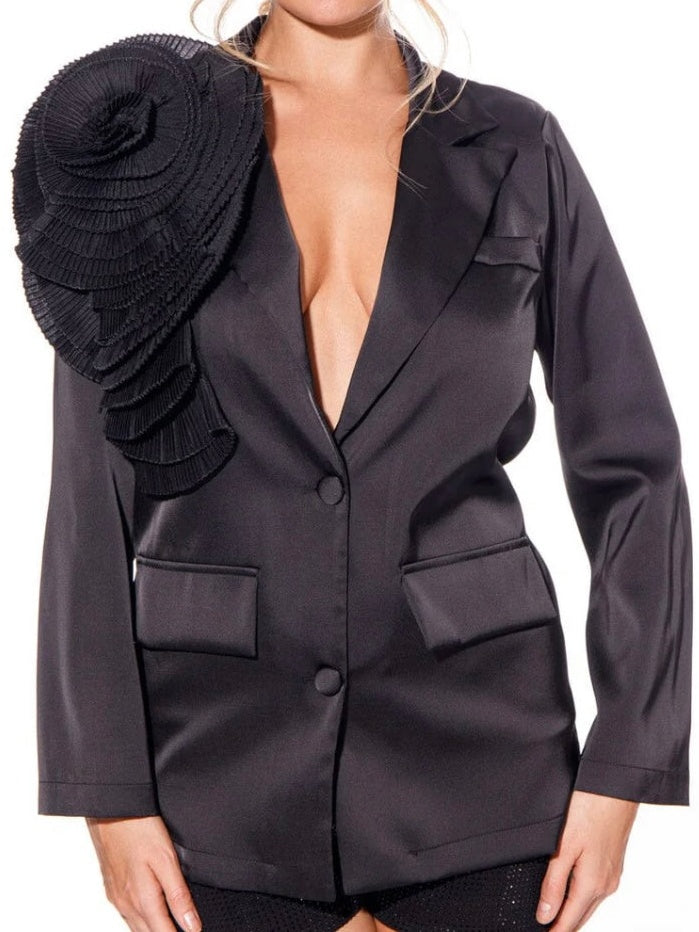 Highlight your look with this gorgeous satin style blazer which features a collared neckline with notched lapel, long sleeves, double button front closure, faux front pockets and statement 3D pleated floral detail on shoulder; lapel can be worn above or beneath floral detail